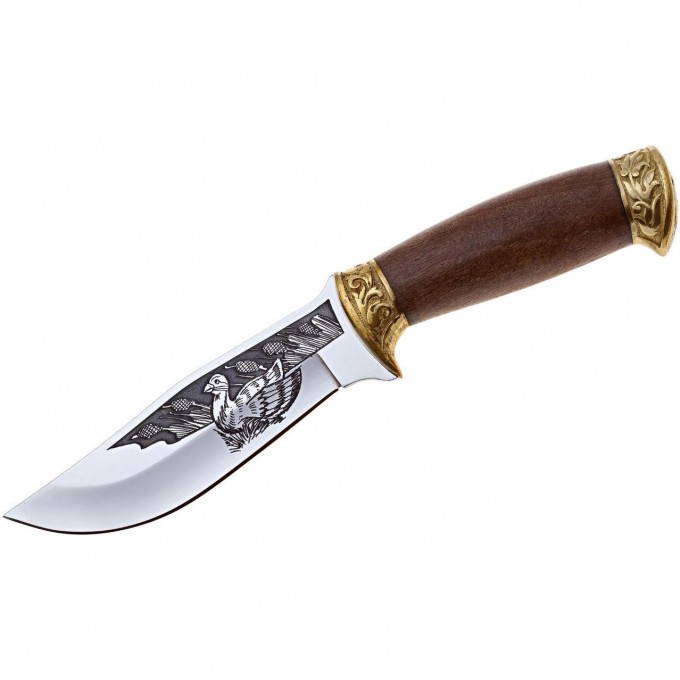 Рукоять из натурального кавказского ореха - ее изящество и эргономичность заслуживают высшей оценки. Если Вы однажды возьмете его в руки - Вам больше не захочется расставаться с ним, настолько он удобно и приятно лежит в руке. Клинок, выкованный из нержавеющей стали AUS-8, обладает совершенными линиями в каждом своем изгибе. Рисунок на клинке ножа выполнен вручную, при помощи метода двойного травления, что позволяет придать рисунку большую глубину и фактурность, добавляет последний штрих в изумительный облик этого ножа. Надежность конструкции не менее важна - для этого нож выполнен цельным, т.е. хвостовик клинка идет до самого обуха. Гарда и навершие ножа выполнены из латуни с тиснением рисунка на металле, благодаря этим элементам нож имеет более привлекательный внешний вид и прекрасно подойдет в качестве подарка.