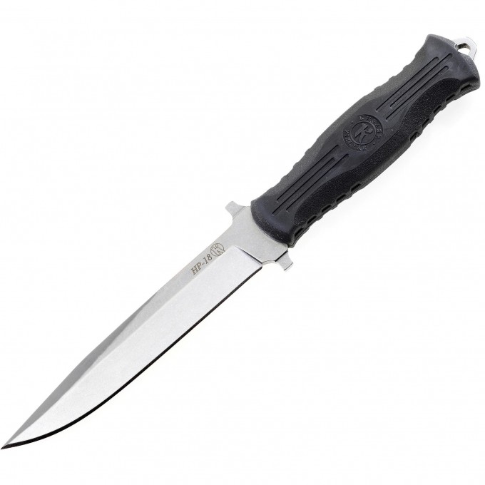 НР-18 современная интерпретация легендарного ножа разведчика 40-х годов. К классической форме клинка, неоднократно проверенной временем, была добавлена симметричная рукоять из эластрона, что позволило повысить удобство удержания и позволило сделать работу с ножом комфортной и уверенной при любом хвате. Чехол получил кардинальные изменения, по сравнению со своим предшественником. Теперь нож имеет современную одежку из ударопрочного АБС пластика, с возможностью фиксации при помощи различных крепежных систем. Сталь на клинке используется серийная AUS-8 c твердостью клинка 58-59 HRC. Она весьма неприхотлива, легко точится, не ржавеет и имеет хорошую прочность на излом.