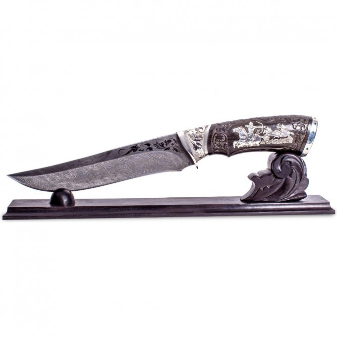 Рукоять ножа сделана из черного дерева, по краям которой располагаются гарды, покрытые серебром и золотом. По центру рукояти мастер вырезал из серебра хазарских войнов с луками. Подставка сделана из черного дерева. Клинок боевой из дамасской стали, хорошо заточен, а ярковыраженная гарда под палец придаст надежности хвата.